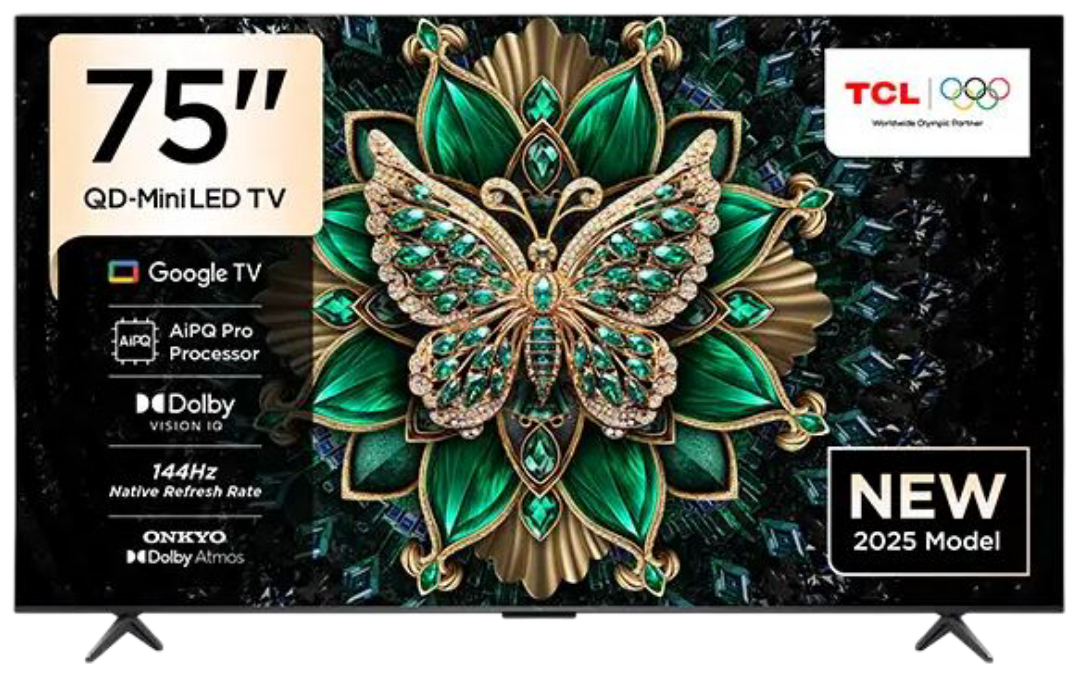 TCL 75 Inch QD Mini LED 4K Google TV – Resolution 3840 x 2160, Native Refresh Rate 144Hz , Color Gamut 93% DCI-P3, HDR Support Dolby Vision IQ, HDR10+, HLG, Contrast Ratio 5500:1, Peak Brightness up to 1000 nits. Operating System Google TV with Google Assistant. Connectivity includes 4x HDMI 2.1 (eARC/ARC), USB 2.0/3.x, Ethernet LAN, dual-band Wi-Fi, Bluetooth 5.4. Dimensions without stand: approx. 1890 x 1086 x 57.9 mm; with stand: 1890 x 1161 x 372 mm, Weight approx. 23 kg, VESA mount 600 x 400 mm. Warranty 3 years.